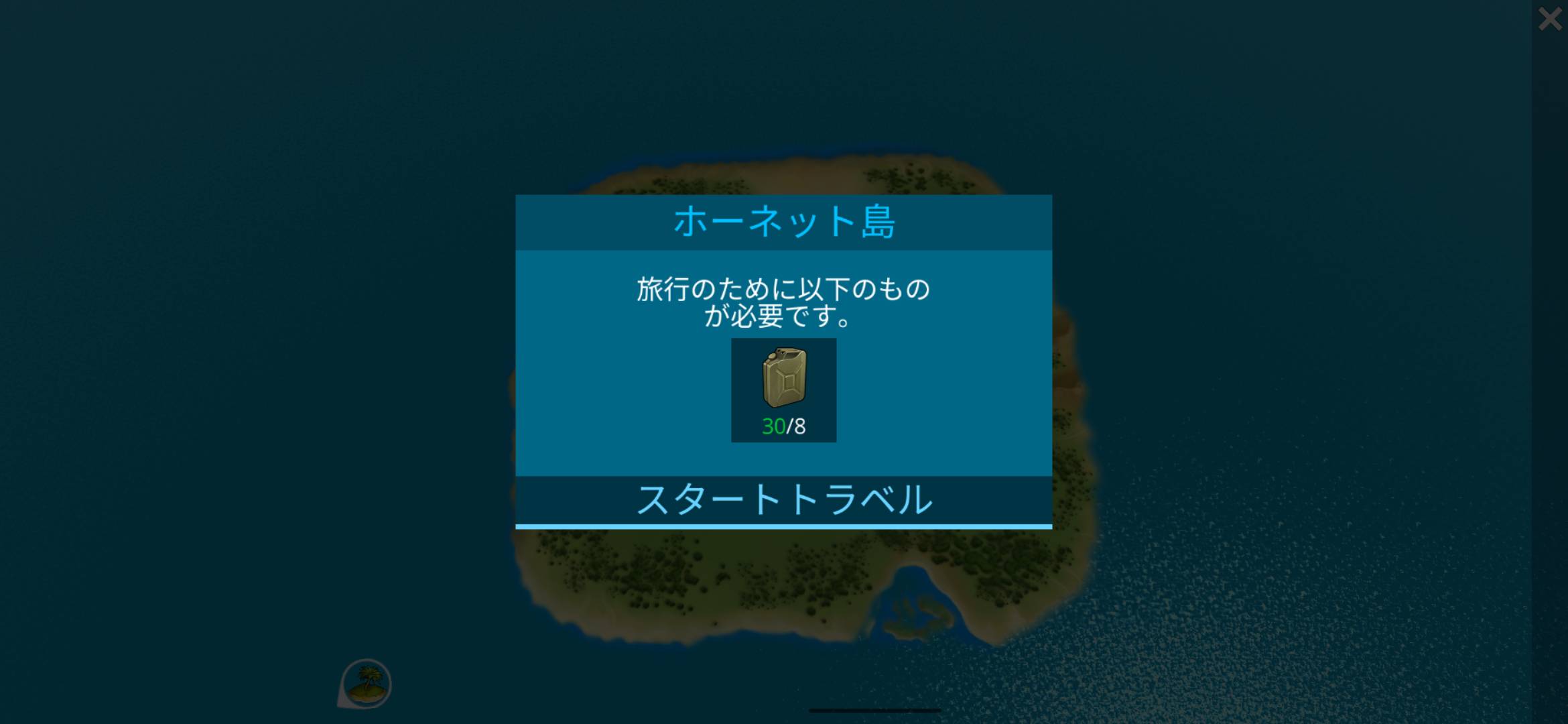ボートに乗った状態で島のマップを開き、大きい島をタッチし「スタートトラベル」を押すことでガソリンと自分のやる気を消費して行くことが出来ます。