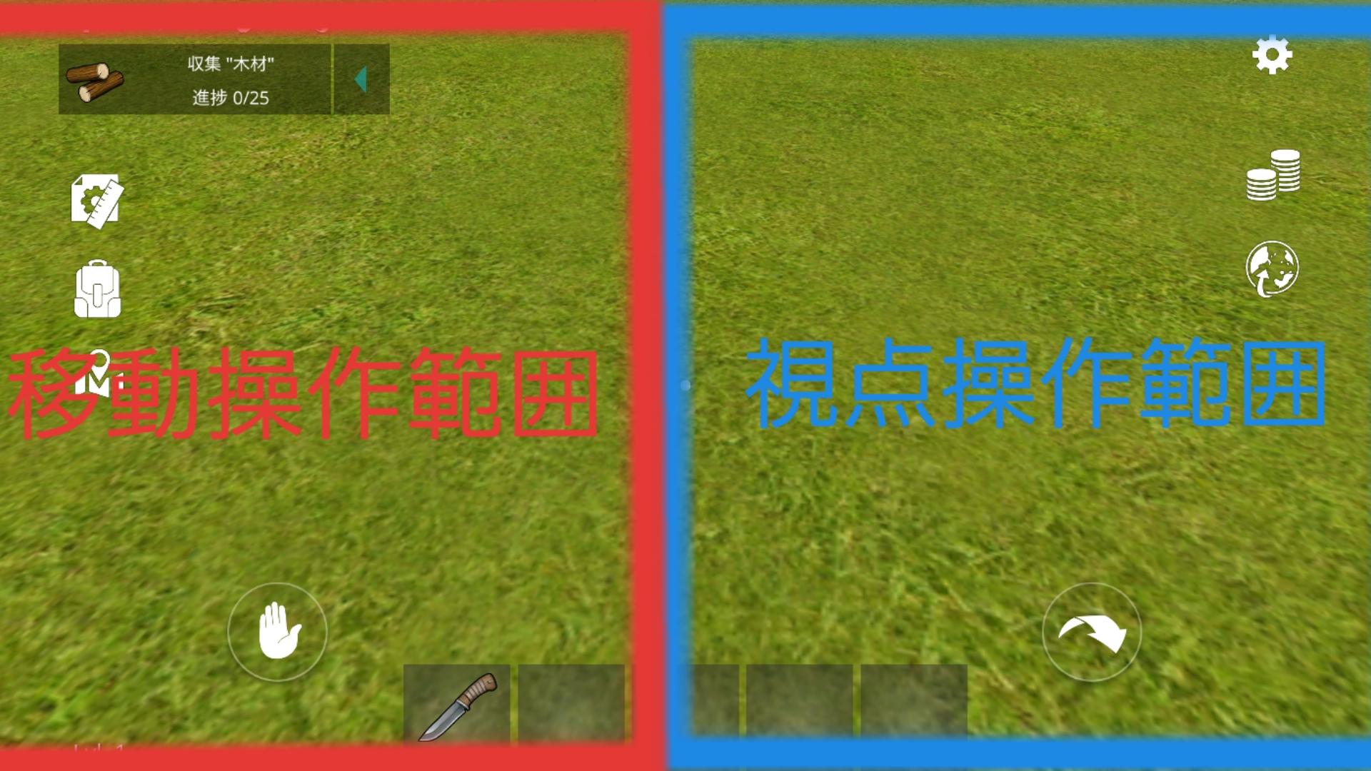 - 道具・武器を使用する…道具や武器を手に持つことで、このボタンが表示される。このボタンを押すことで、今自分が手に持っている道具や武器を使うことができる。