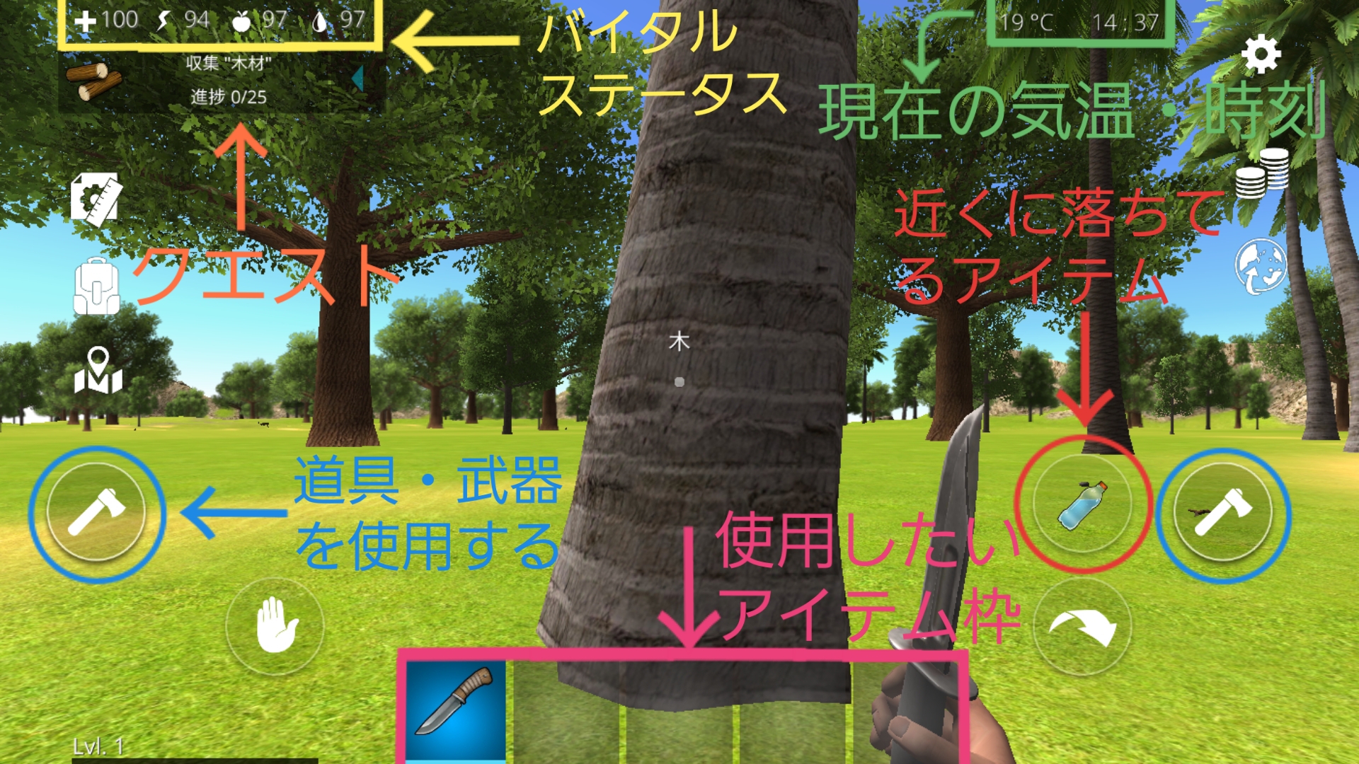 木を叩いたり、鉱石を掘ったりする時などに必須な操作です。 - バイタルステータス…現在の自分の健康状態を表す数値。左から順に、HP/体力(+マーク)・エネルギー(雷のマーク)・空腹感(リンゴみたいなマーク)・喉の渇き(💧みたいなマーク)を表す。