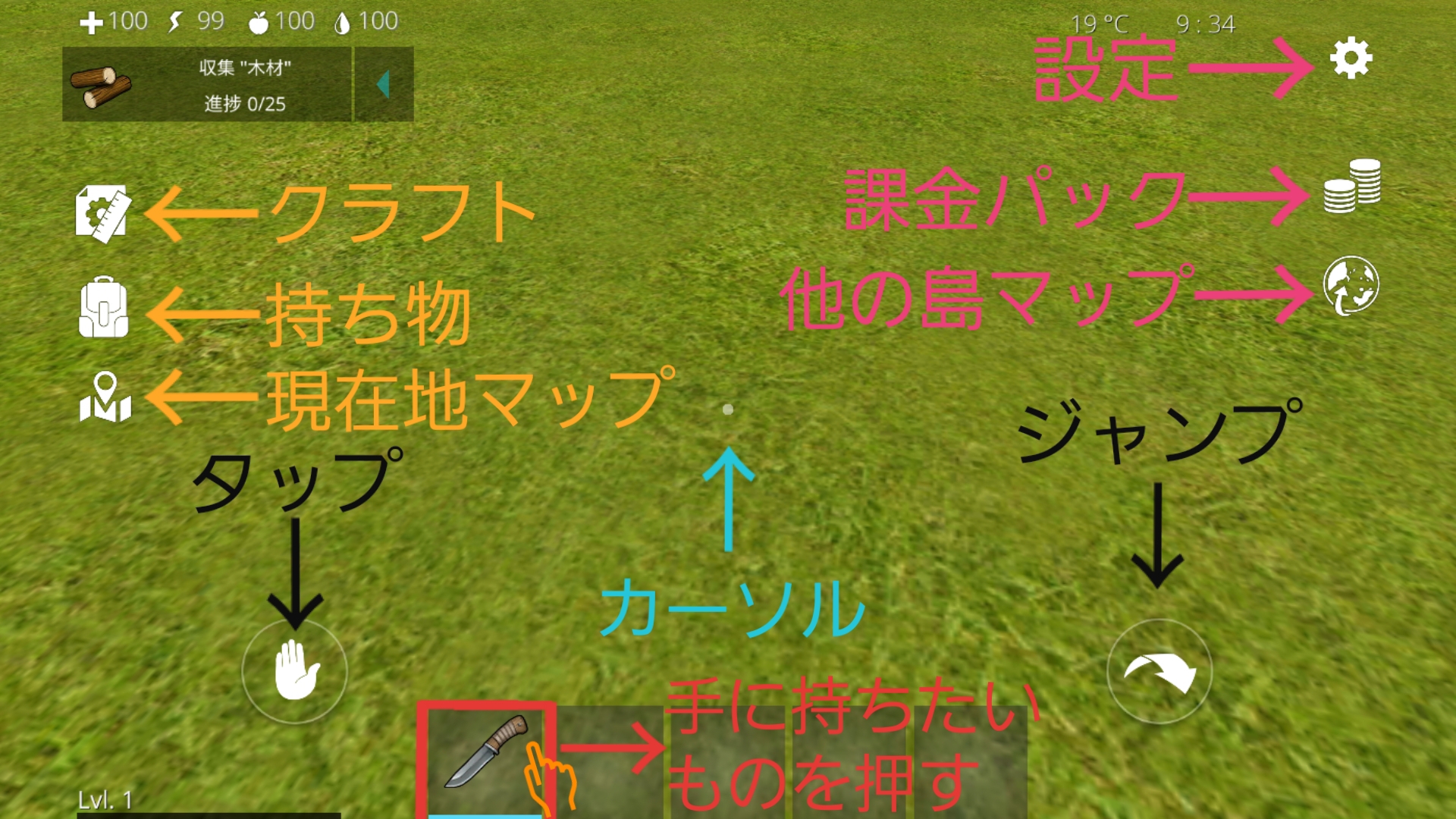 - タップ…カーソルで合わせた対象を操作する。(タップで操作できるもの→アイテムが入った物を開く・ドアを開く・車に乗る時など)