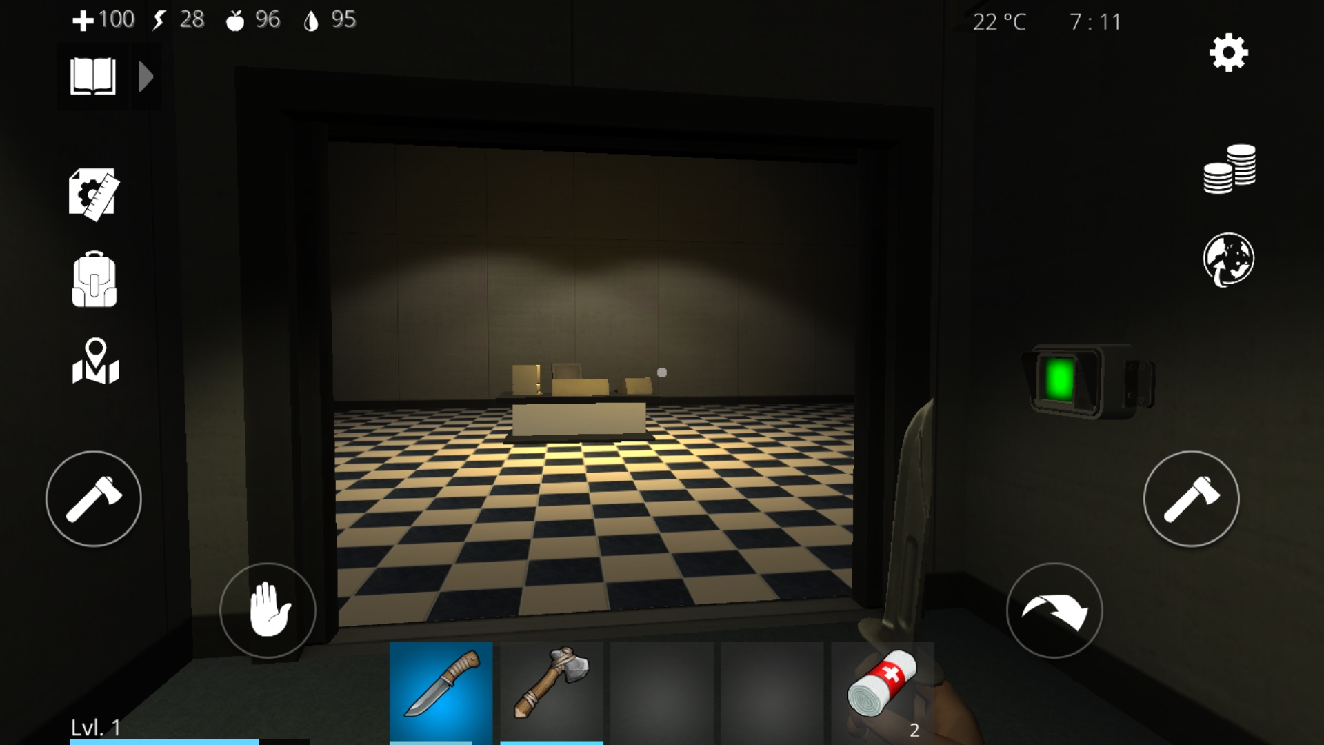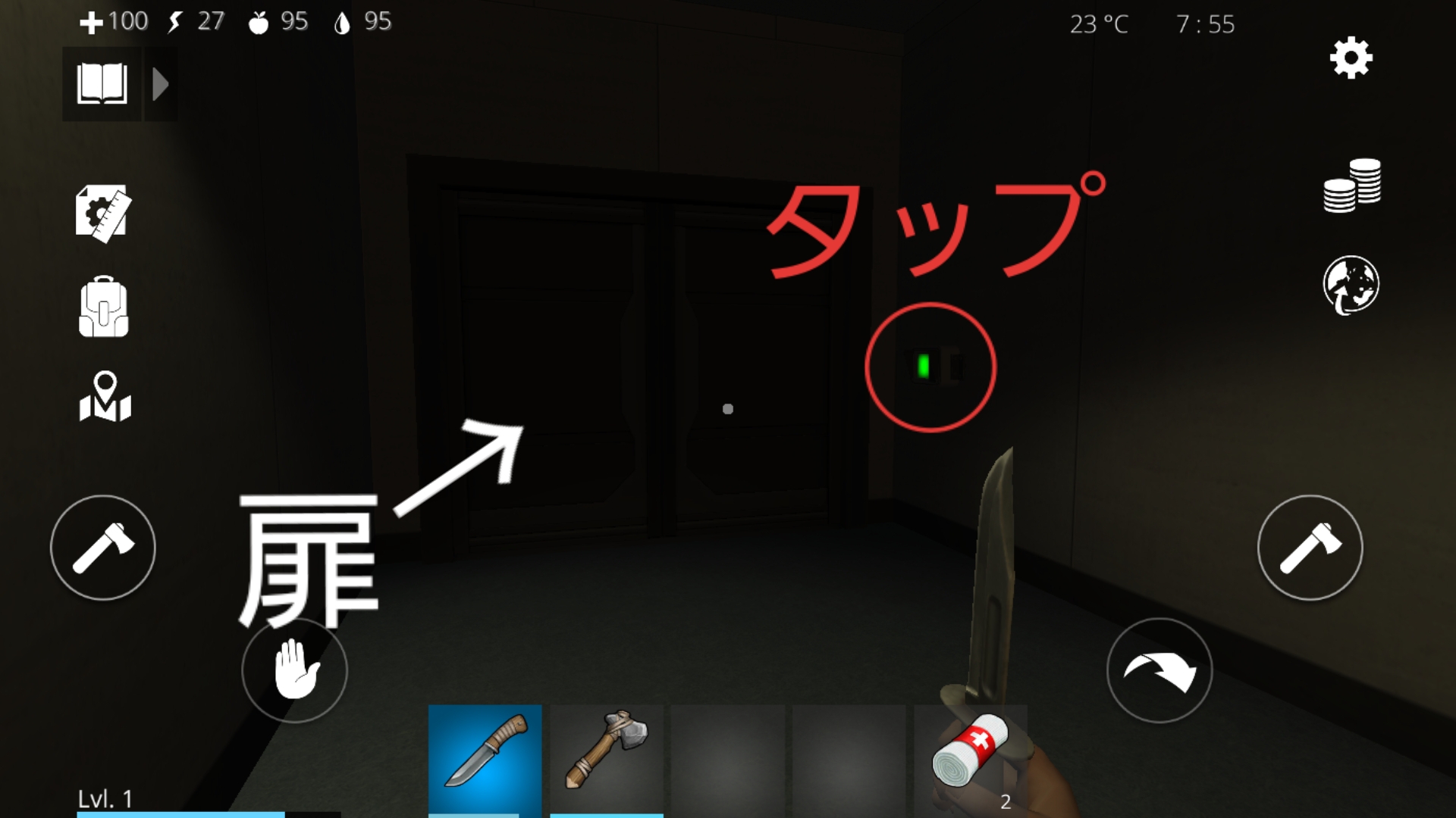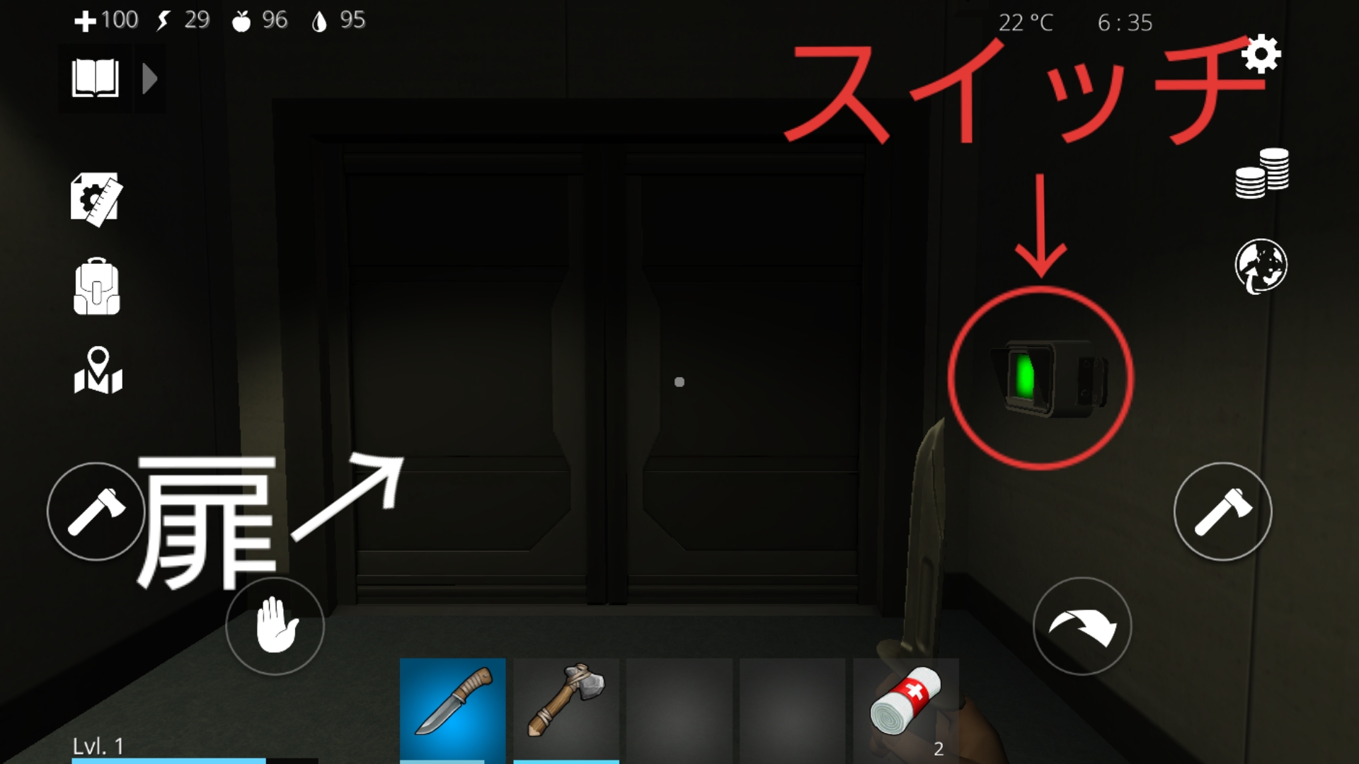 3.左側の部屋に入る(この部屋には資源がある。ドアのすぐ横の緑色スイッチを押すとドアが開く)。